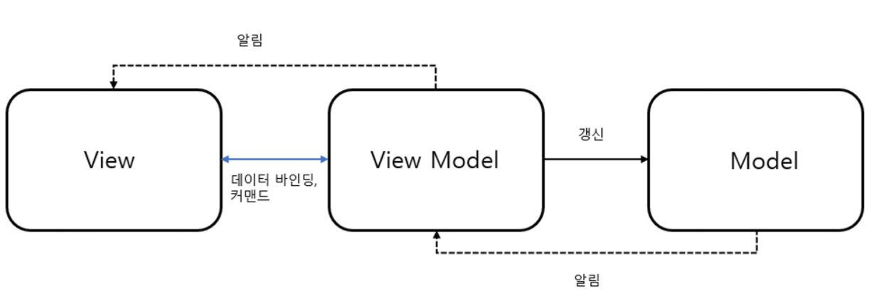 MVVM 패턴은 MVC의 C에 해당하는 컨트롤러가 뷰모델로 바뀐 패턴이다.