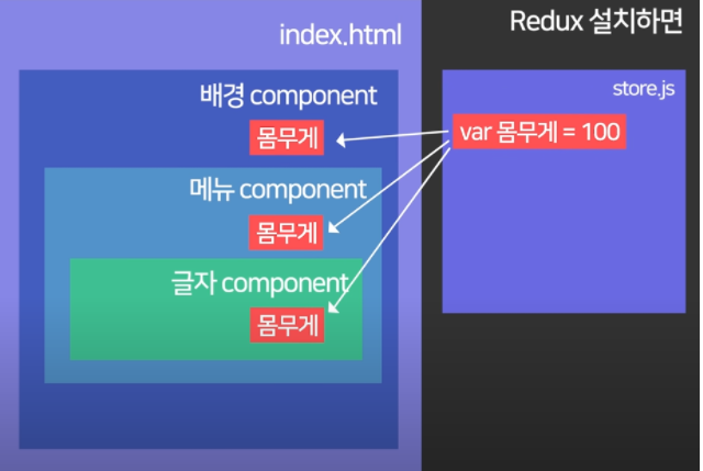state를 내부 컴퍼넌트에서 사용하기 위해서는 props문법을 사용해야 합니다 하지만, 많은 컴퍼넌트 중첩이 발생할경우 그에 따른 props가 필요하기 때문에 Redux라는 라이브러리르 사용하면 편하게 사용 가능합니다 .